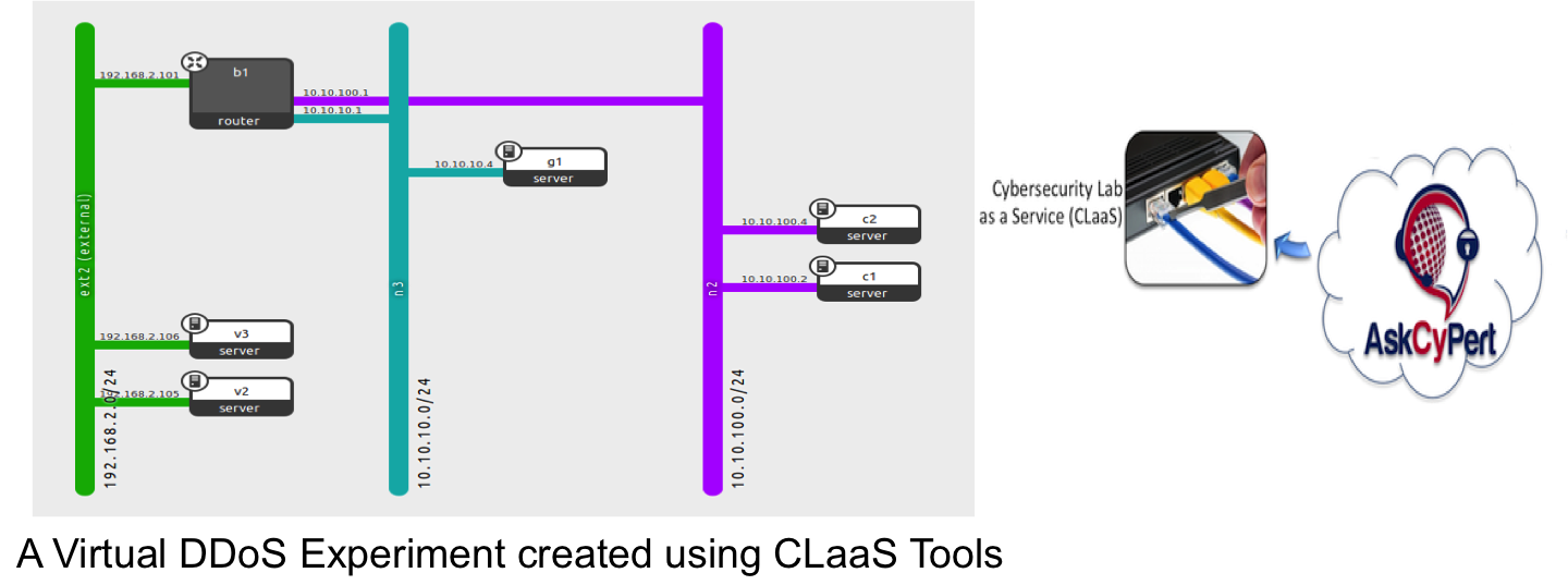 • Response: Support personnel leads how to use the CLaaS-room to build a DDoS virtual experiment as shown below: